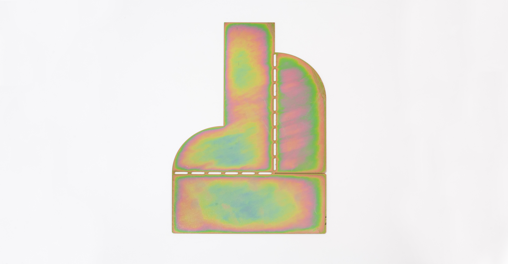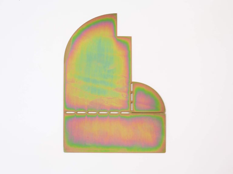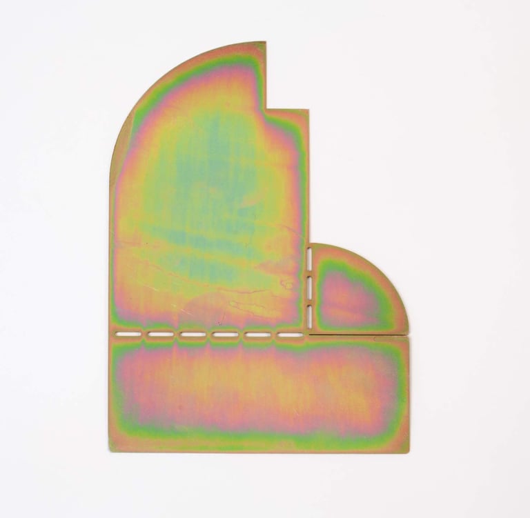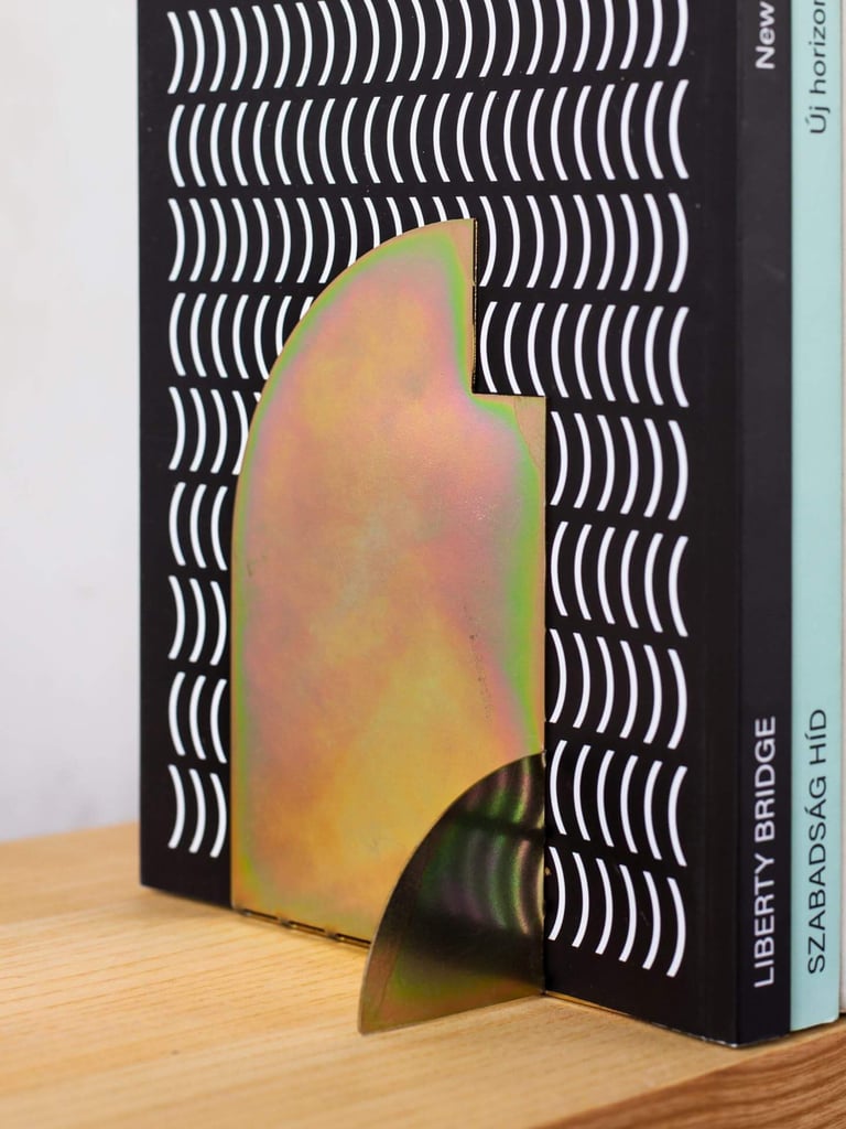 The ARCHETYPE BOOKEND reinterprets iconic architectural silhouettes through pure geometric forms and playful composition. Each piece starts as a flat metal sheet that folds into a sculptural structure, combining precision and spontaneity. Its iridescent surface shifts in color and light, giving a refined yet experimental character to the object. Designed to stand between function and ornament, it celebrates the beauty of form, balance, and material transformation.