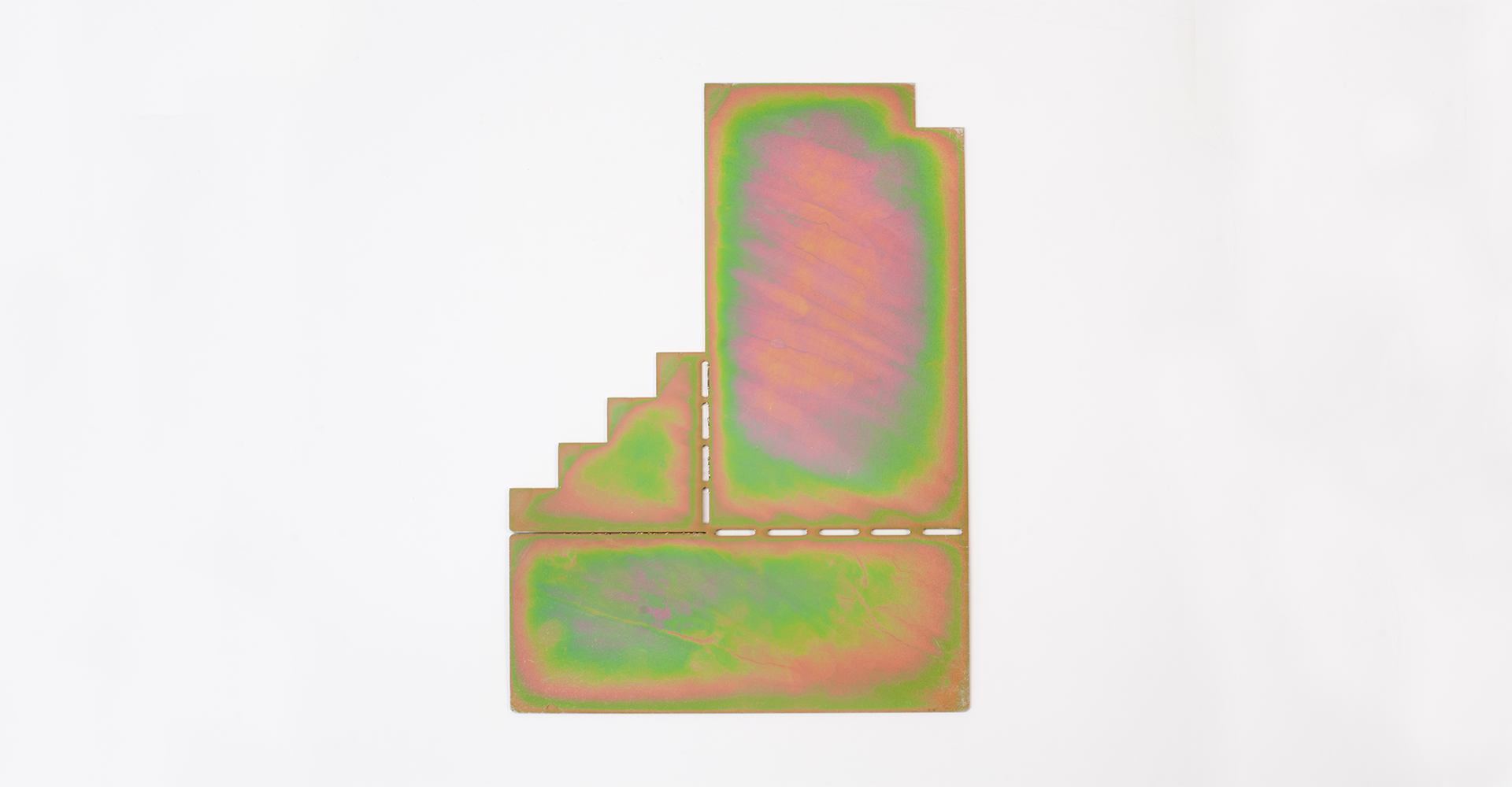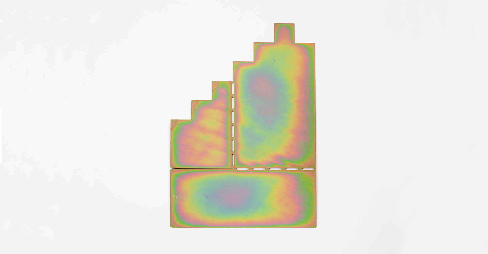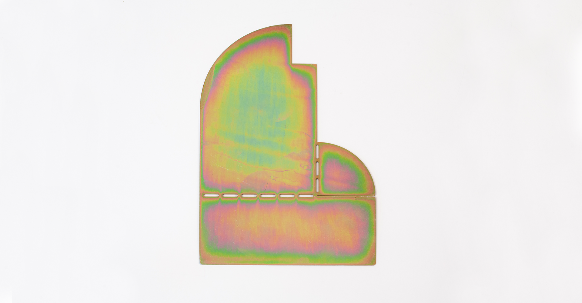 The ARCHETYPE BOOKEND reinterprets iconic architectural silhouettes through pure geometric forms and playful composition. Each piece starts as a flat metal sheet that folds into a sculptural structure, combining precision and spontaneity. Its iridescent surface shifts in color and light, giving a refined yet experimental character to the object. Designed to stand between function and ornament, it celebrates the beauty of form, balance, and material transformation.