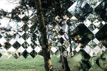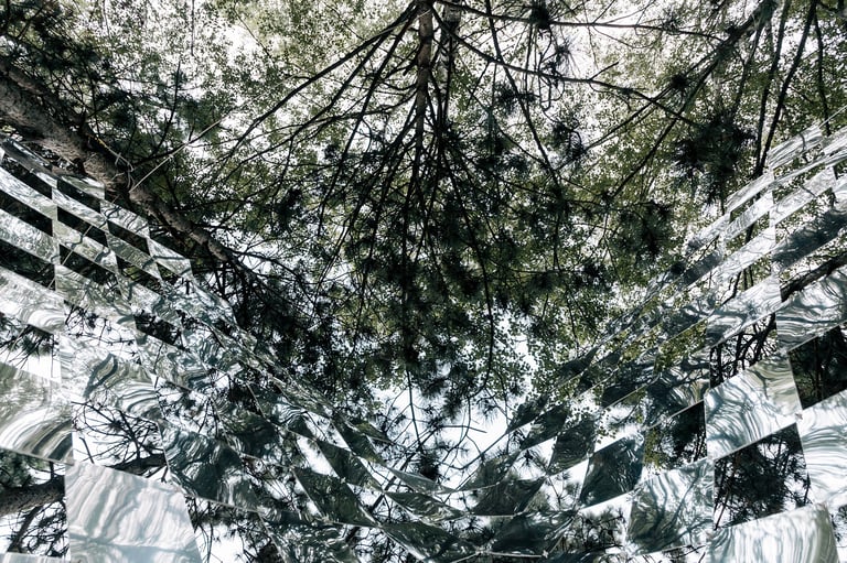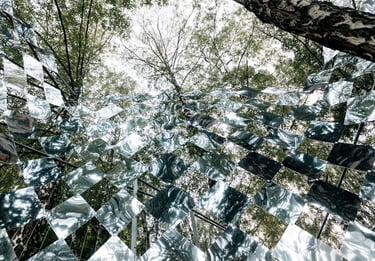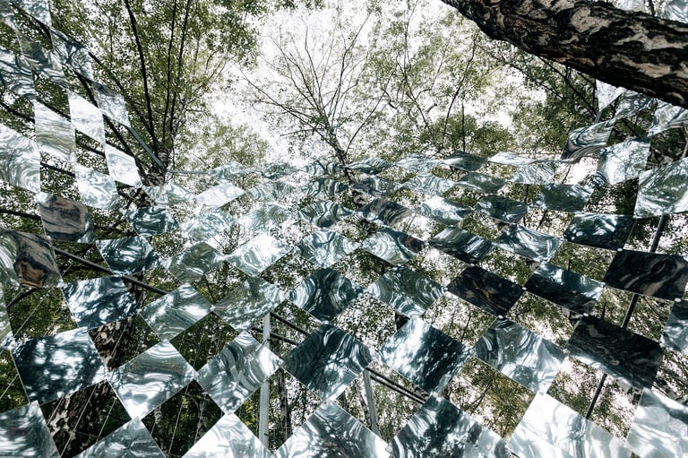 More than 1,200 reflective panels were arranged in a checkered pattern inspired by camouflage motifs, fragmenting and refracting views of the forest and sky. This fragmentation allowed visitors to experience shifting perspectives as they moved through the installation, dissolving the boundary between the built form and its natural setting.