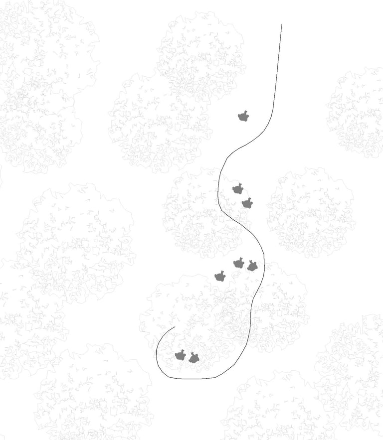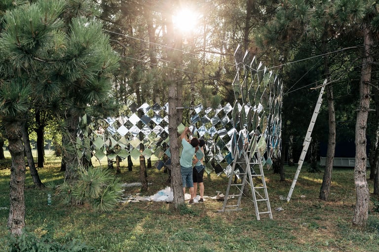 For the Sziget Festival — one of Europe’s largest music and cultural events held annually in Budapest— we designed a temporary mirrored pavilion intended to reconnect visitors with the surrounding forest landscape. The concept draws on a simple yet powerful architectural gesture: a 25-meter-long curvilinear band of mirrors suspended between trees, creating a dynamic interplay of light, reflection, and nature.